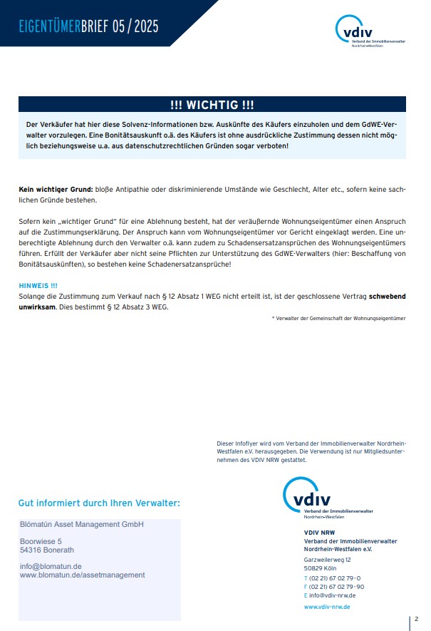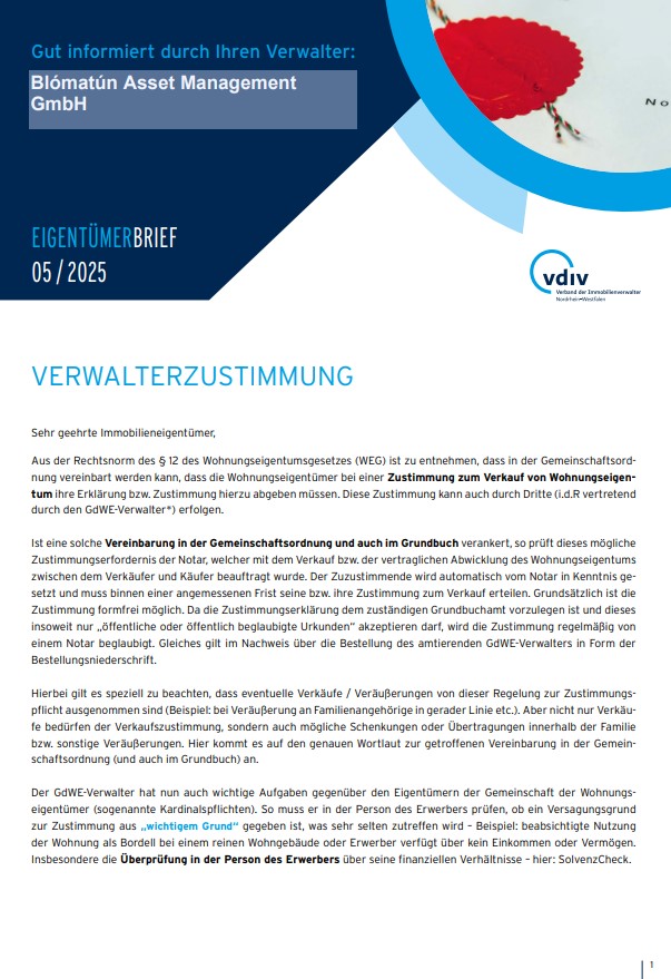 Aktueller Eigentümerbrief VDIV Verband: Verwalterzustimmung