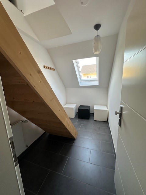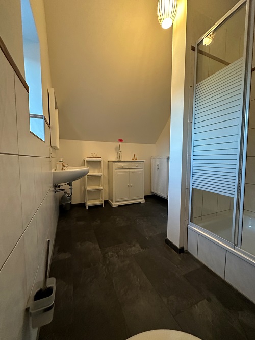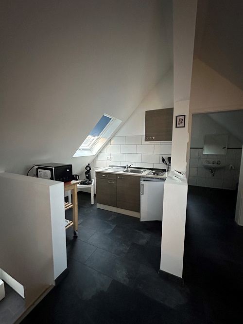 Machen Sie Urlaub in unserer 50 m² großen und voll möblierten Ferienwohnung. Die im 2. Obergeschoß gelegene helle Ferienwohnung ist über 2 Etagen gebaut. Sie umfasst einen Flurbereich mit Garderobe im unteren Teil, wovon dann eine kleine Treppe in den oberen Teil der Wohnung führt. Dieser ist ausgestattet mit einem Wohnbereich mit gemütlicher Sitzecke mit Couch und Fernseher, einem kleinem Essbereich, einer Singleküche, einem Schlafbereich mit Doppelbett (1,40m) sowie einem geräumigem Badezimmer mit Dusche und WC. Sat-TV ist vorhanden.