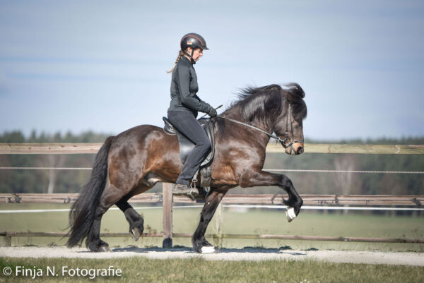 Myrkvi vom Kronshof: Als Sohn des legendären Óðinn vom Habichtswald und Enkel des Elitevererbers Hnokki frá Fellskoti vereint er zwei der bedeutendsten Blutlinien u. bringt nicht nur beeindruckende Genetik mit, sondern auch sportliche Klasse u. außergewöhnlichen Charakter. Sein Vater Óðinn ist höchstbeurteilter dt. Hengst mit 9er Reiteigenschaften (mehrfacher F1 DIM-Gewinner, Zuchtweltmeister 2019 u. F1 Vizeweltmeister 2025). Mit diesen Genen sorgte Myrkvi schon früh für Aufsehen: Als erstes Fohlen überhaupt erhielt er eine Gangnote von 8,50. Mit seinen elastischen, kraftvollen Gängen u. seiner Leichtfüßigkeit begeistert er bis heute: FIZO 2020: 8,31 (Ext. 8,27, Reit 8,33) u. Noten von 8,5 Tölt/ Trab/Galopp, 8,0 Pass. Auch als Vererber setzt Myrkvi Maßstäbe: Seine Tochter wurde 2025 Zuchtweltmeisterin der 6J.Stuten. Myrkvi ist ein ausdrucksstarker, eleganter Hengst mit außergewöhnlicher Elastizität, klarer Tempofähigkeit in allen Gängen und einem liebevollen Charakter, der begeistert.